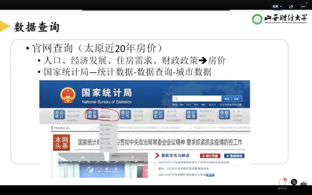赵文老师针对数据收集与整理进行了专题分享。从一手数据和二手数据的获得途径为同学们介绍了调研问卷设计方法和规范,分享了目前主流的数据库和文献库,鼓励同学们既可以通过问卷设计进行实践调研,也可以充分利用专业数据库获取支撑研究问题的论据。重点从年鉴数据、企业数据等专题数据库介绍了如何进行指标提取与整理。在与同学们进行互动交流过程中,针对同学们提出的海量数据如何进行预处理以及如何应用问卷星进行设计给出了建议。
