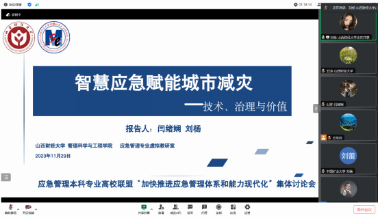 20231129日,由应急管理本科专业高校联盟主办,西北大学公共管理学院(应急管理学院)承办的“加快推进应急管理体系和能力现代化”集体讨论会成功召开,本次会议采用腾讯会议方式,会议报告分为联盟专家组和西北大学研究生组两个部分。山西财经大学做爱直播 院长闫绪娴教授、应急管理教研室主任王迪、应急管理教研室教师闫志华作为联盟专家组成员,受邀进行学术报告。