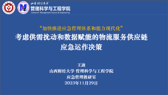 应急管理教研室主任王迪作了题为《考虑供需扰动和数据赋能的物流服务供应链应急运作决策》的报告,阐述了应急物流在应急物流体系中的“生命线”和“先行官”作用,并结合《“十四五”国家应急体系规划》《“十四五”现代物流发展规划》等政策文件,系统梳理我国应急物流体系的建设进程、关键节点及重要任务,在此基础上,介绍了如何刻画并揭示“供需扰动”和“数字技术赋能”两种因素对物流服务供应链应急运作决策的影响机理。