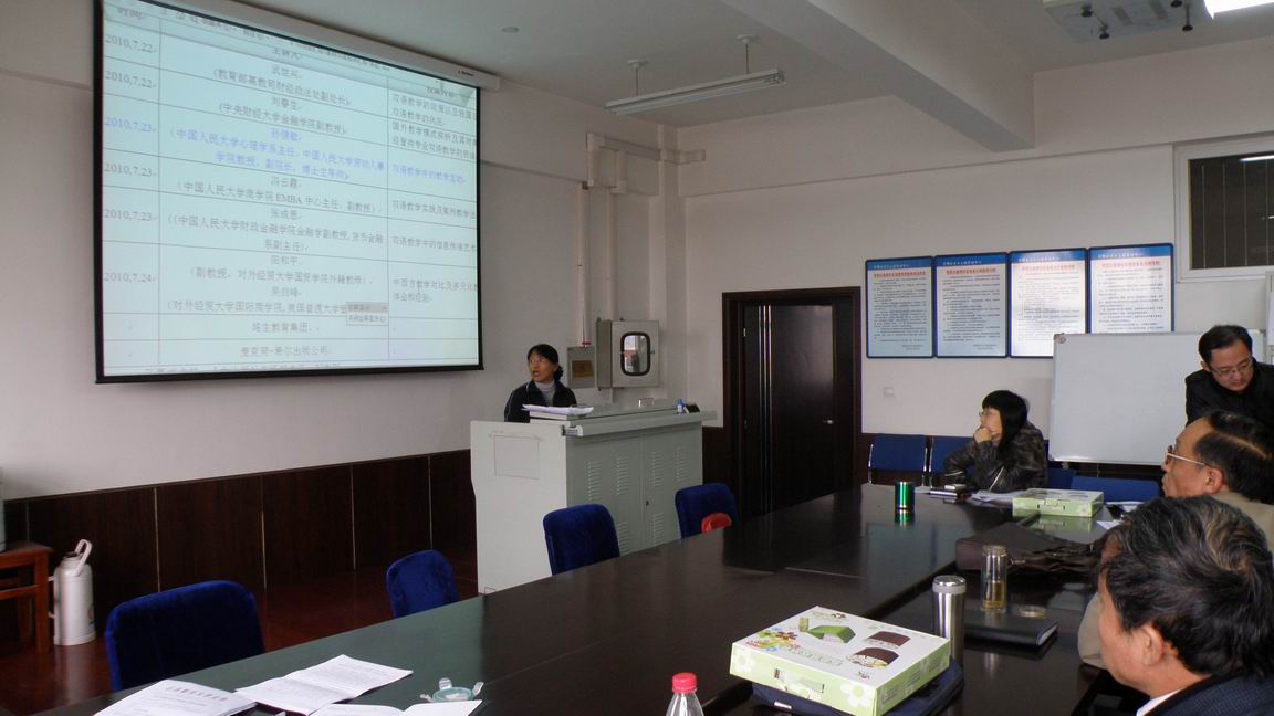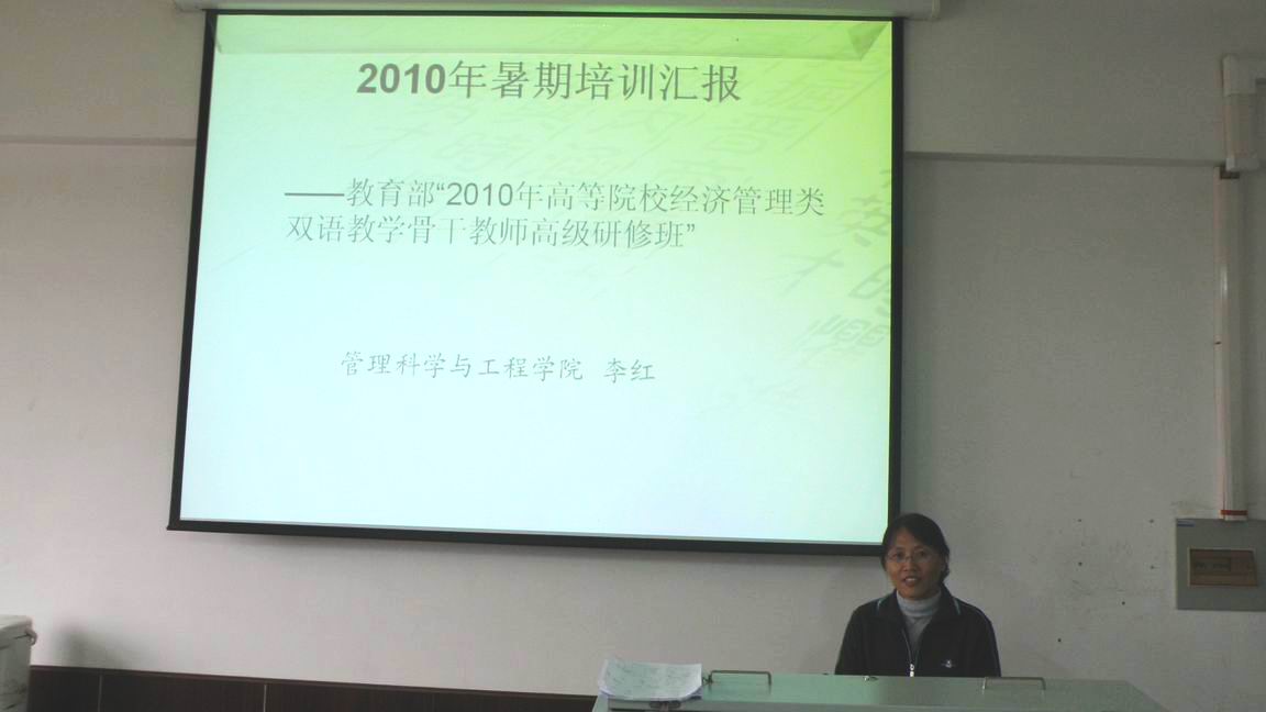 2010年10月27日下午4时,李红博士参加教育部“2010年高等院校经济管理类双语教学骨干教师高级研修班”汇报会在做爱直播 SA610沙盘模拟实验室举行,全院教师听取了汇报。